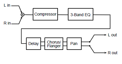 コンプレッサー(Cmp)、イコライザー(EQ)、ディレイ(Dly)、コーラスまたはフランジャー(CF)を直列に接続しています。