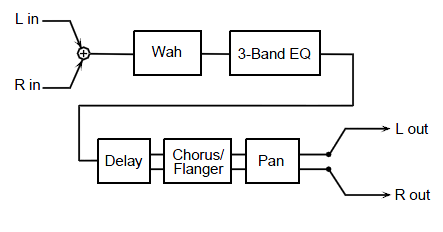 オート・ワウ(AW)、イコライザー(EQ)、ディレイ(Dly)、コーラスまたはフランジャー( CF)を直列に接続しています。