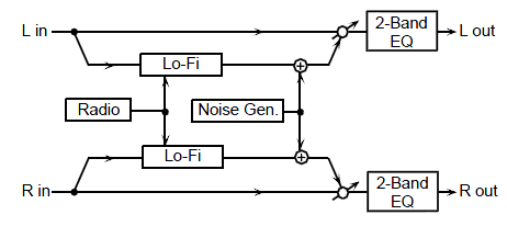 ステレオ仕様のローファイ・ノイズです。ローファイ効果に加えて、ラジオ・ノイズ、ディスク・ノイズ等さまざまなノイズを発生させます
