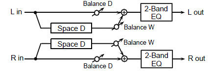 スペースD は2 相のモジュレーションをステレオでかける多重コーラスです。変調感はありませんが、透明感のあるコーラス効果が得られます。